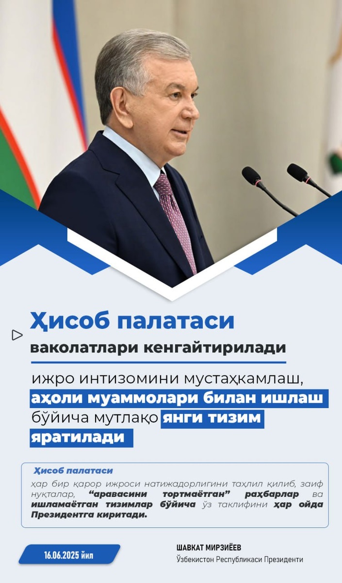 ⚡️Ҳисоб палатаси ваколатлари кенгайтирилди Президент Шавкат Мирзиёев 16 июнь кунги йиғилишда: Ҳисоб палатасига янги ваколатлар берилади. Эндиликда, ижро интизомини мустаҳкамлаш ва аҳоли муаммолари билан ишлаш бўйича янги, қатъий тизим яратилади. Бошқача қилиб айтганда: “Аравани тортмаётган” раҳбарлар аниқланади ва ҳар ойда Президентга хабар берилади! Бу нима дегани? 🔺 Одамлар дардини эшитмайдиган, мурожаатга жавоб бермайдиган, масалани чўзадиган раҳбарлар энди беъмалол ишлаб юролмайди! 🔺 Ҳар бир қарорнинг қай даражада амалга ошгани, фуқаролар бундан қанчалик рози — ҳаммаси назоратда бўлади. Каналимизга обуна бўлинг ва энг сўнгги янгиликларни кузатиб боринг Jizzaxnews |Тelegram | Facebook | Dzen | YouTubе