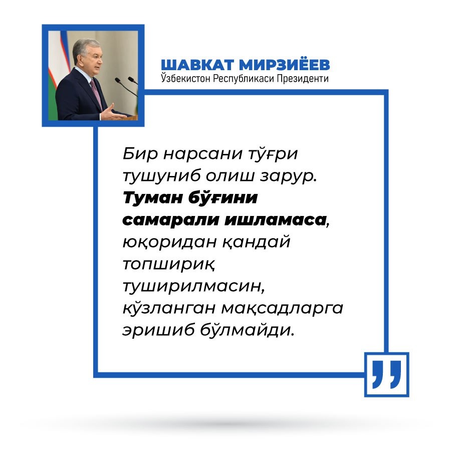 ❗️Ана энди туманларда ривожланиш бўлади “Бир нарсани тўғри тушуниб олиш зарур. Туман бўғини самарали ишламаса, юқоридан қандай топшириқ туширилмасин, кўзланган мақсадларга эришиб бўлмайди”, — Президент. 💬 Биринчидан, тумандаги ходимнинг ойлиги вазирликка қараганда 3-4 карра кам. Шу боис кадрлар қўнимсиз. 💬 Иккинчидан, ҳеч ким узоқни ўйлаб, 3-5 йиллик режа қилмаяпти. Фақат кунлик ишлар билан овора. Туман ҳокимининг ўзи ҳам, ўринбосарлари ҳам 40 фоиз вақтини йиғилиш ўтказишга сарфлаяпти. Бундай шароитда ривожланиш бўладими? Албатта йўқ! 📈 Давлат раҳбари туман бўғини яхши ишлашини истамоқда, чунки ўсиш — тепадан пастга қараб эмас, пастдан тепага қараб бўлади! Каналимизга обуна бўлинг ва энг сўнгги янгиликларни кузатиб боринг Jizzaxnews |Тelegram | Facebook | Dzen | YouTubе