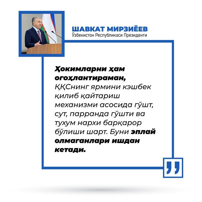 ⚡️Гўшт, сут, тухум ва парранда гўшти нархлари ошмаслиги учун тадбиркорларга ҚҚСнинг ярмини қайтариш (кэшбек) механизми жорий қилинди. ✅Президент ушбу механизм тадбиркорлар учун енгиллик яратиши ва энг асосийси, аҳоли учун нархларни барқарор ушлаб туришга хизмат қилишини таъкидлади. ❗️Давлат раҳбари ушбу тизим аниқ ва узлуксиз ишлаши шартлигини қайд этар экан, нархларни барқарор сақлашни эплай олмаган ҳокимларга қатъий чоралар кўрилишини билдириб ўтди. Каналимизга обуна бўлинг ва энг сўнгги янгиликларни кузатиб боринг Jizzaxnews |Тelegram | Facebook | Dzen | YouTubе