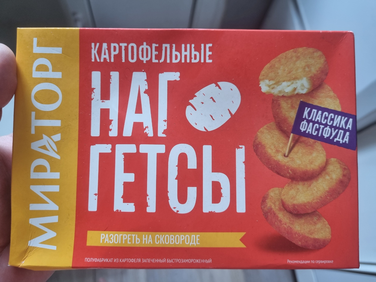 На днях мне пришлось совершить кулинарнок открытие - заказав в Яндекс Лавке пачку наггетсов за 169 рублей, я получил вот это: Признаюсь, я как-то не заметил сразу что они картофельные и клюнул на цену. Я даже и не знал что они бывают картофельные, ведь согласно определению Вики: Ну что ж, раз я попался на уловку, то остается только все это пожарить и вам рассказать! Итак, смотрим чудо-состав: Мелко, много и сложно) Вынимаем пакет и пересчитываем: 10 штучек. Не особо много. За такую цену могли бы побольше картошки навалить. Смотрим как готовить: Судя по инструкции, достаточно обжарить на сковороде, так и поступим: Выглядит неплохо, все крепкие, панировка держится, корочка есть. На вкус это драники как драники, и далеко не самые лучшие. Чесночку бы хоть добавили, а так тертая картошка как картошка. Еще и сыровата оказалась. Сомнительное, короче говоря, удовольствие. Поставим им тройбан и посоветуем быть поосторожней. А если хочется дешевых наггетсов - ищите в Магните вот эти рыбные: А