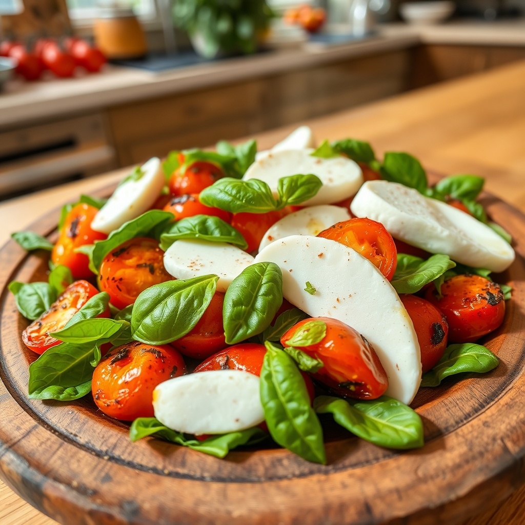 Конечно! Вот подробный рецепт вкусного салата из жареных помидоров, моцареллы и базилика: Ингредиенты: 3-4 средних помидора 200 г моцареллы (лучше брать свежую моцареллу буффало или салатную моцареллу) Свежий базилик — примерно 1 пучок 2-3 столовые ложки оливкового масла Extra Virgin 1-2 столовые ложки бальзамического уксуса или бальзамического сиропа (по желанию) Соль и свежемолотый черный перец — по вкусу Опционально: немного чеснока или чесночного масла для жарки Инструкции: 1. Подготовка помидоров: Вымойте помидоры и нарежьте их на толстые кружки или половинки, в зависимости от размера. Посолите и поперчите их по вкусу. 2. Жарка помидоров: Разогрейте сковороду на среднем огне и добавьте 1-2 столовые ложки оливкового масла. Можно добавить немного измельченного чеснока для аромата. Выложите помидоры на сковороду и жарьте примерно 2-3 минуты с каждой стороны, пока они не станут мягкими и немного подрумянятся. Готовые помидоры переложите на тарелку и дайте немного остыть. 3. Подг