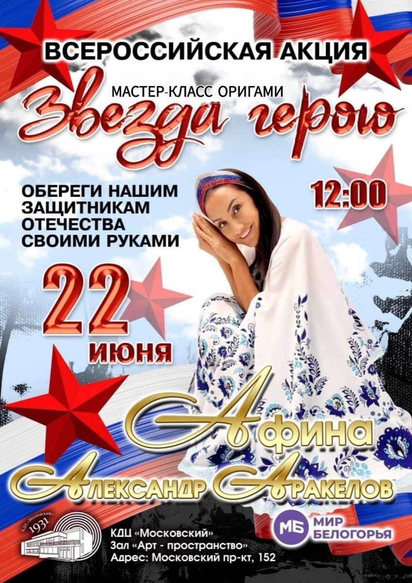 ⭐️Певица Афина поддержала акцию «Звезда Герою» Она призывала всех внести свой вклад в дело поддержки бойцов. «Я вместе с моими поклонниками с гордостью поддерживаю акцию «Звезда Герою». Наши защитники – настоящие герои, и каждая звезда, созданная руками россиян, станет для них оберегом и символом нашей поддержки. Давайте вместе покажем, что вся Россия с ними!» – отметила певица. Отметим, что акцию уже поддержали волонтёрские объединения из разных городов России, многие муниципалитеты Белгородской области, народное движение «Бессмертный полк России», блогеры, артисты, фронтовые музыканты, писатели, а также представители СМИ и социальных медиа. Напомним, чтобы стать частью акции, нужно изготовить красную звезду в технике оригами и написать на ней слова поддержки: «Вся Россия с тобой». Создать звезду можно самостоятельно. Как это сделать – здесь. 22 июня пройдут отдельные мастер-классы по созданию оберегов: в Санкт–Петербурге акцию организуют в культурно-досуговом центре «Московский