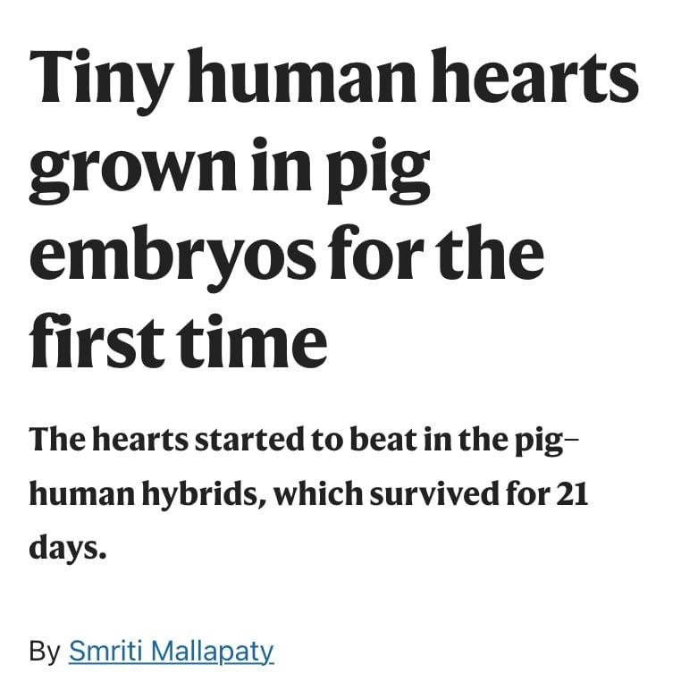 Учёные впервые вырастили человеческие сердца внутри эмбрионов свиней — органы развивались 21 день Для этого свиньям удалили гены, отвечающие за формирование собственных органов, и ввели стволовые клетки человека, чтобы вырастить настоящие человеческие органы. Свиньи могут стать идеальными донорами. Сердце, печень, почки — всё можно будет заменить.