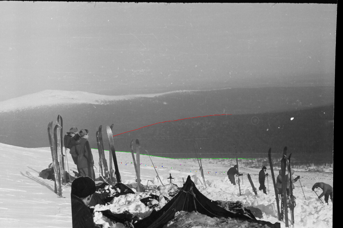 Соединились с Вижайским спасательным отрядом. Они верховья Лозьвы обследовали и следов не обнаружено. Они перешли верховья Ауспии. Их последняя стоянка и лыжня,которая идет на хребет и в горах теряется.Их люди разбиты на 3 группы одна группа на хребет по течению Ауспии