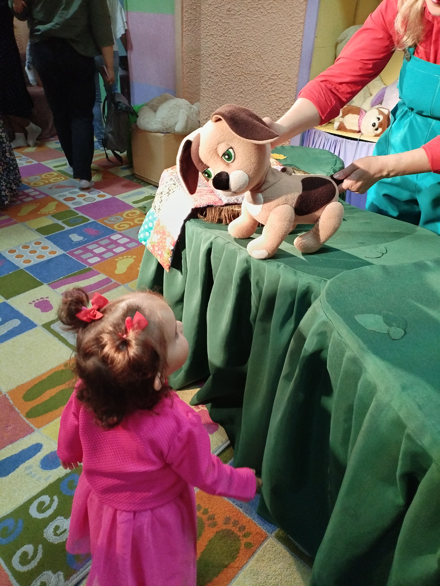 И от пчелки щеночка спасали. Амелия за пчелой бегала, руками махала, прогоняла. Сева сидел весь спектакль с папой, там участвовал в спектакле. А Амелия по всему залу рассекала. Где герои, там и она. Очень воодушевлена была игрой актёров.