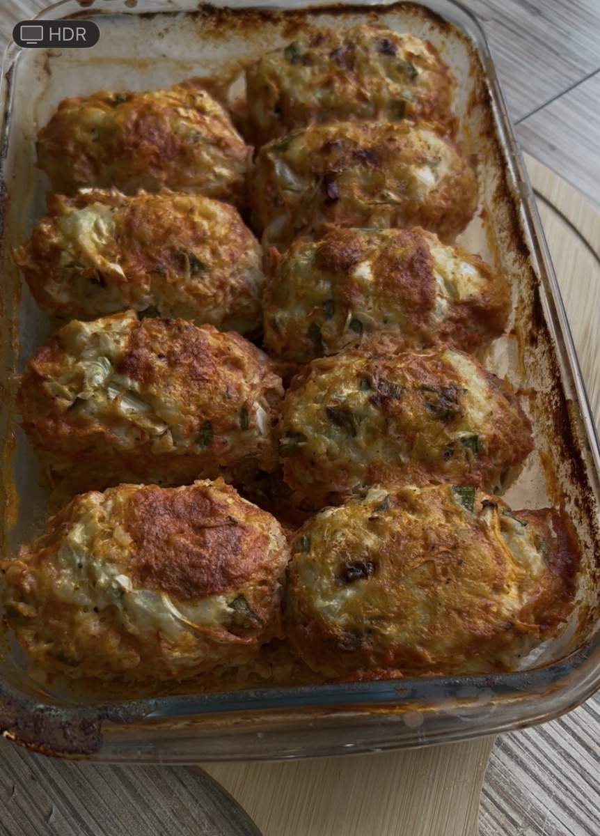 Ленивые голубцы (ПП вариант) Ингредиенты: К фаршу добавляем рис, яйцо Зеленый лук Капусту, соль и специи по вкусу Вымешиваем Формируем голубцы и выкладываем в форму для запекания Готовим соус для заливки голубцов. Соединяем томатную пасту, чеснок, сливки Добавляем воду, соль и любимые специи. Перемешиваем Заливаем голубцы соусом. Выпекаем при 180, 40- 50 мин(ориентируйтесь по своей духовке, вам понадобится возможно чуть больше времени, или меньше) Ленивые голубцы готовы. Вкуснотища😋. Всем приятного аппетита❤️