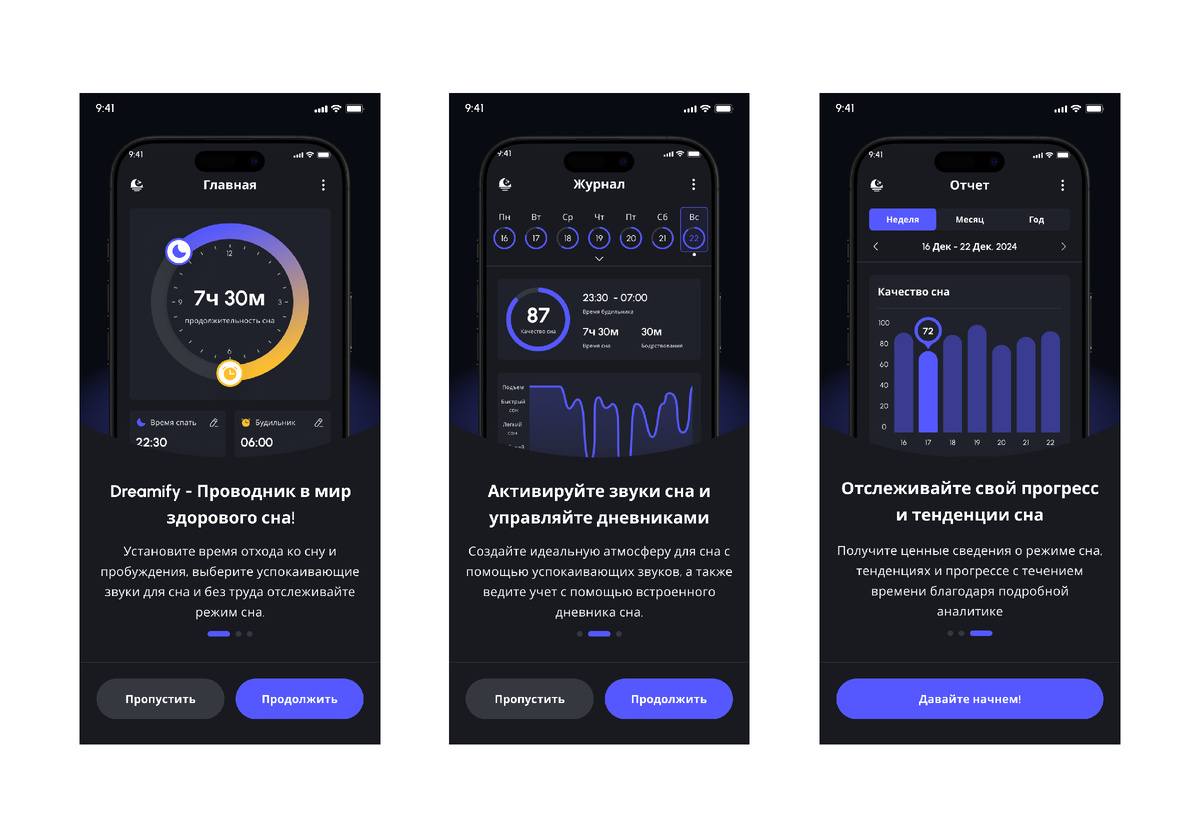 На рынке много трекеров сна, но у большинства из них или перегруженный интерфейс, или они не объясняют, что делать с полученными данными. Dreamify ставит не визуализацию ради визуализации, а инсайты ради пользы. Я ориентируюсь на пользователей, которые не хотят тратить время на настройки, но хотят результата.