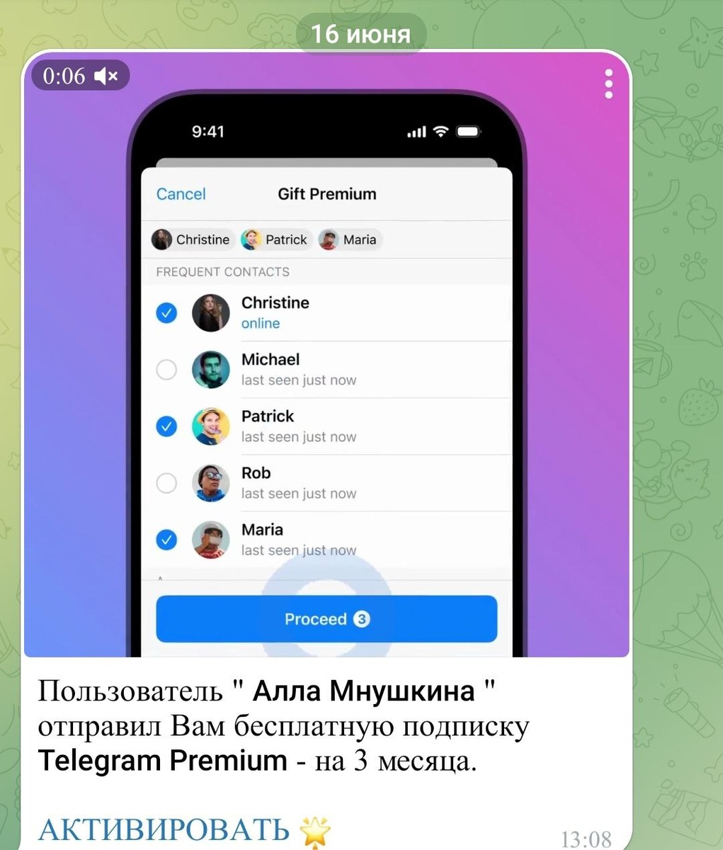 "Благодарность", которую я заслужила 😂😂😂 Мне тут сегодня пришёл подарок: Telegram Premium на 3 месяца. БЕСПЛАТНО. От человека, с которым я даже не знакома, но которому я помогла. Подписка. Активировать. Тут же. Срочно. Я, конечно, человек волшебный. И благодарность вселенной за мои вибрации — это нормально. 😂😂 Будьте аккуратнее тоже с таким мошенничеством ❌ Обнимаю ♥️