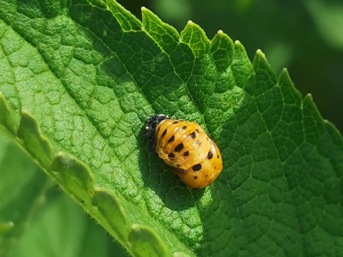 Благодаря обилию в этом году божьих коровок всех мастей, я теперь знаю, что это не личинка, похожая на колорадского жука)) Это куколка семиточечной божьей коровки! Сидят они открыто на поверхности листьев: Я конечно, по окраске подозревала кто это, но теперь то точно видно, потому что куколка на глазах превращается... превращается куколка .... в божью коровку, только поначалу она вот такая смешная и желтая) Зверь быстро сделал ноги и спрятался под листком. Осталась только шкурка