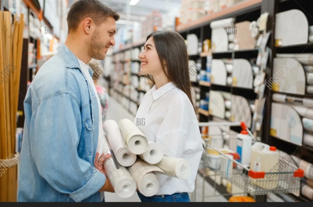 Девушка в синем комбинезоне рабочего быстро вытащила из кармашка телефон, набрала номер и узнала у родственницы сколько рулонов требуется странным покупателям. Она же посоветовала обои на кухню.