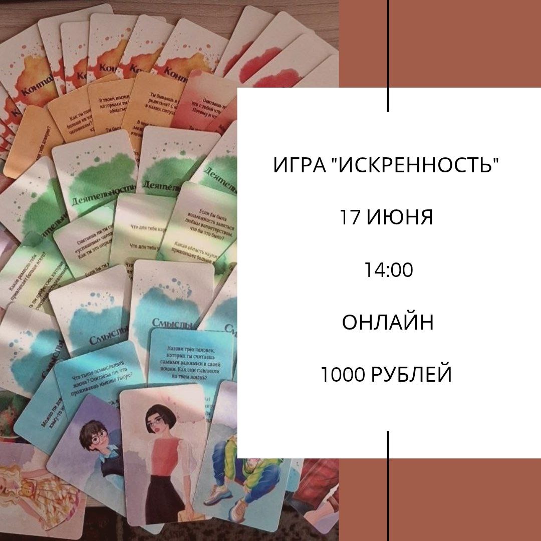 🎲 Игра "Искренность" — уже завтра! Это не просто игра. Это — мягкое, бережное погружение к себе настоящей. Без обвинений. Без спешки. Без масок Если внутри накопилось — чувства, вопросы, обида, усталость или тревога — приходите Будем разбирать, смотреть, проживать и отпускать 📅 Когда: 17 июня 🕑 Во сколько: 14:00 (Мск) 📍 Формат: онлайн 💰 Цена: 1000 рублей 💌 Запись в личку: @GallinaFomina Будет пространство, где можно быть собой И тебя там очень ждут 🌿