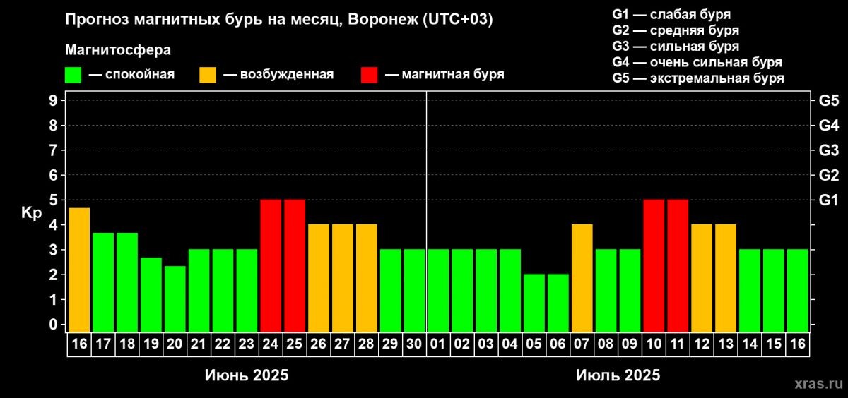 В период с 24 по 25 июня, а также с 11 по 12 июля, Воронежская область столкнётся с магнитной бурей. Интенсивность магнитных возмущений будет слабой, уровень G1. Кроме того, в июне солнечная активность может затронуть региона ещё несколько раз: 16, 26, 27 и 28 числа.