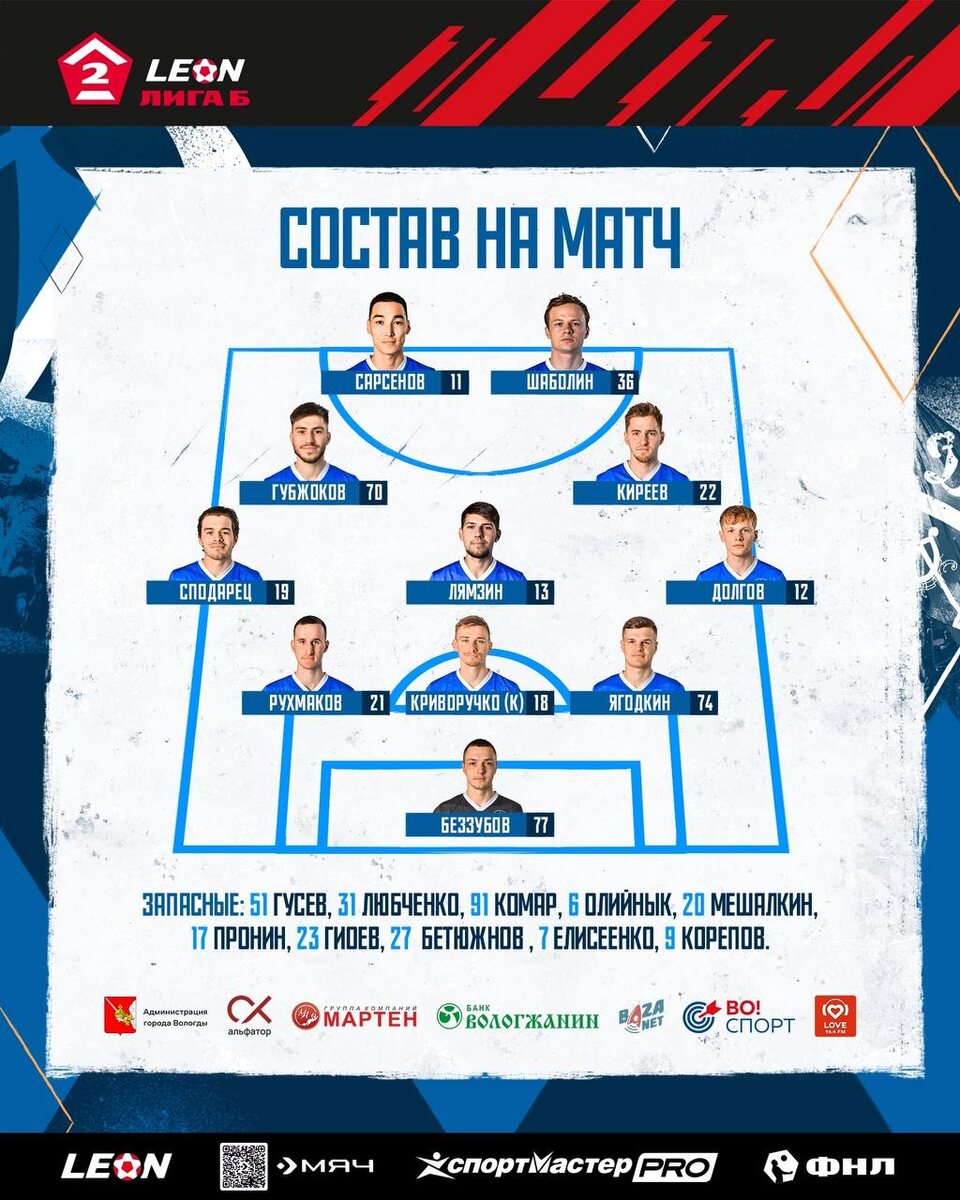Наш состав на матч с «Луки-Энергия»⚡ 🔹Беззубов в воротах 🔹Губжоков в роли инсайда 🔹Шаболин и Сарсенов в атаке ❕Михаил Петролай и Владимир Ярлыков продолжают восстанавливаться после повреждений. @dynamovologda