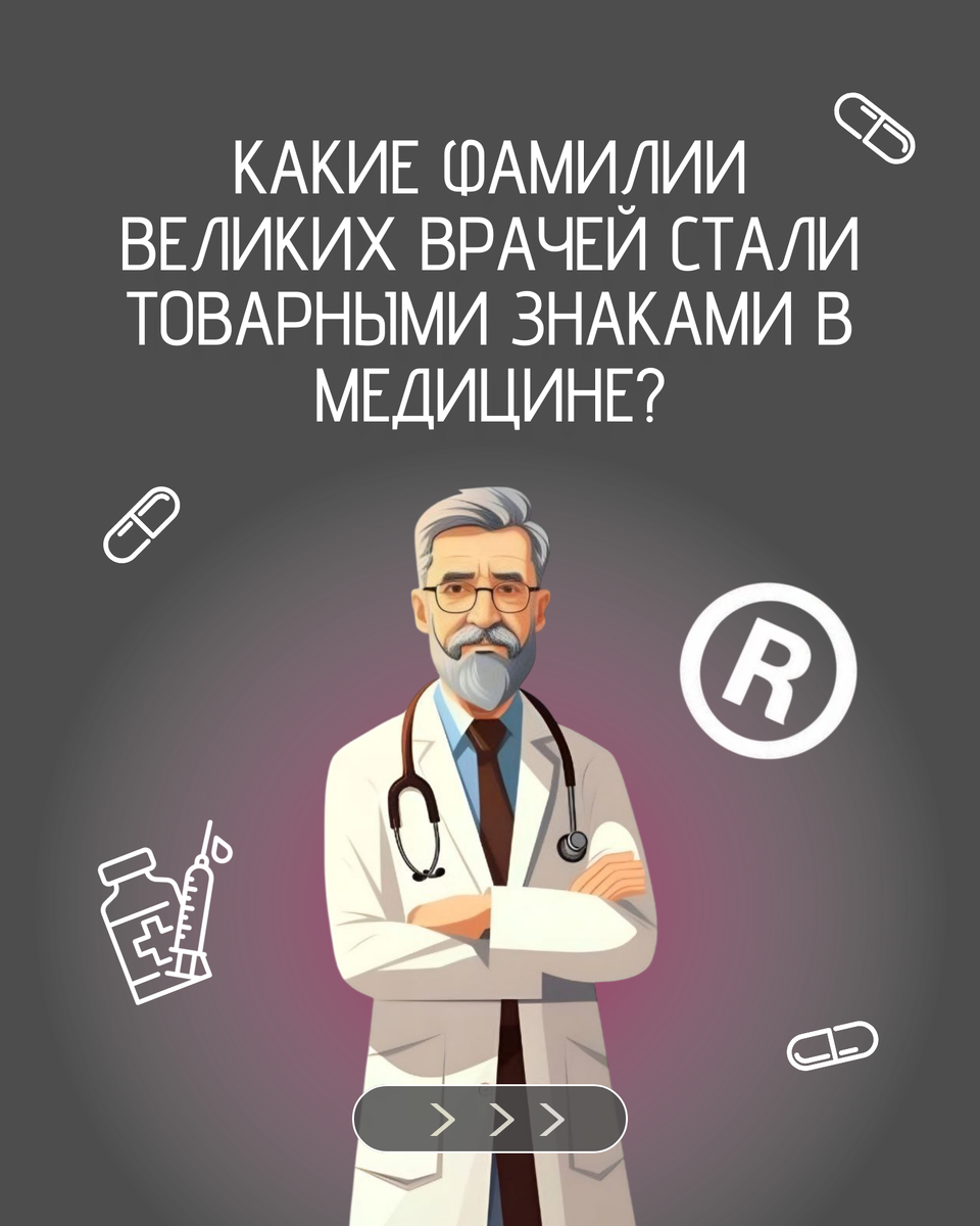 👩⚕️ В честь Дня медицинского работника мы с гордостью вспоминаем выдающихся врачей России, чьи открытия и преданность профессии спасали и продолжают спасать миллионы жизней. 📌 В этой карусели краткие истории трёх великих врачей, навсегда вписанных в историю отечественной медицины и ставших символами целых медицинских учреждений, которые по праву носят их имена. Да-да, фамилии врачей, которыми гордится вся страна, сегодня зарегистрированы в Роспатенте. 🔗 Товарный знак №776919 🔗 Товарный знак №377643 🔗 Товарный знак №768994 🔗 Товарный знак №671553 📷 Листайте, чтобы узнать, какие фамилии врачей стали частью брендов современной медицины.