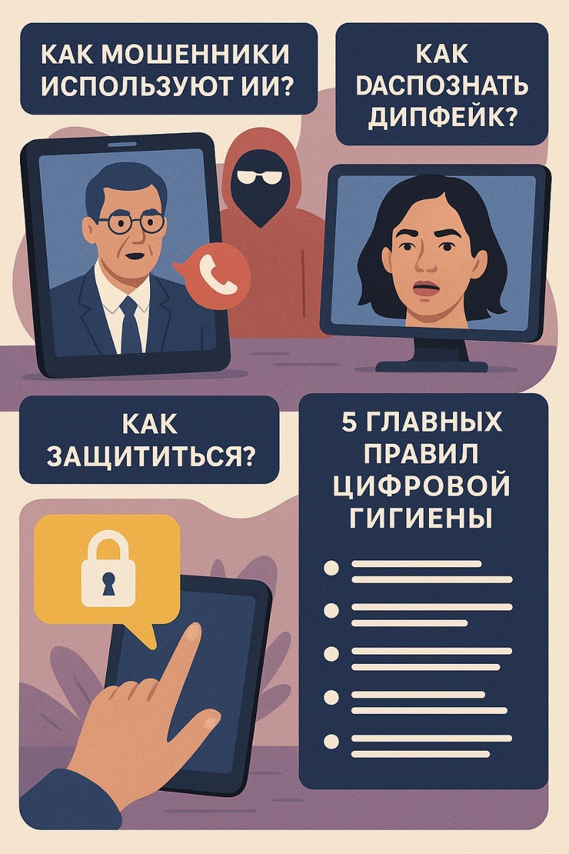 Как мошенники используют ИИ - Дипфейки: Мошенники создают видео и аудио, где человек говорит или делает то, чего не было. Могут звонить якобы от начальника или родственника с просьбой перевести деньги. - Умный фишинг: ИИ пишет письма без ошибок, подстраивается под стиль общения и анализирует соцсети. - Клонирование голоса: По короткой записи делают копию голоса и звонят близким с просьбой о помощи. Как распознать дипфейк - Неестественная мимика, странные движения глаз. - Размытые края, неправильные тени. - Давление, срочность, странные просьбы. - Не может ответить на личный вопрос. Как защититься - Придумайте “стоп-слово” для семьи. - Проверяйте просьбы через другой канал. - Не выкладывайте много личных фото и видео. - Включите двухфакторную аутентификацию. 5 правил цифровой гигиены - “Нулевое доверие” ко всем запросам. - Многоканальная верификация. - “Стоп-слово” с близкими. - Многофакторная аутентификация. - Следите за новыми схемами мошенников. Технологии развиваются, а главная защи