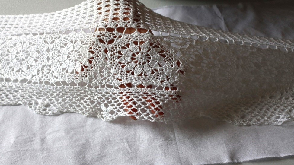 Я давно хотела сшить такую занавеску для кухни. Выбрала белую хлопковую ткань — она лёгкая, дышит и хорошо смотрится на окне. Ещё решила использовать кружево ручной работы. Когда-то я много вязала: салфетки, скатерти, даже большое покрывало, на которое ушёл целый год. Всё это теперь лежит в шкафу. Но кружево так жалко держать без дела! Хочется, чтобы оно украшало дом, а не пылилось на полке.
