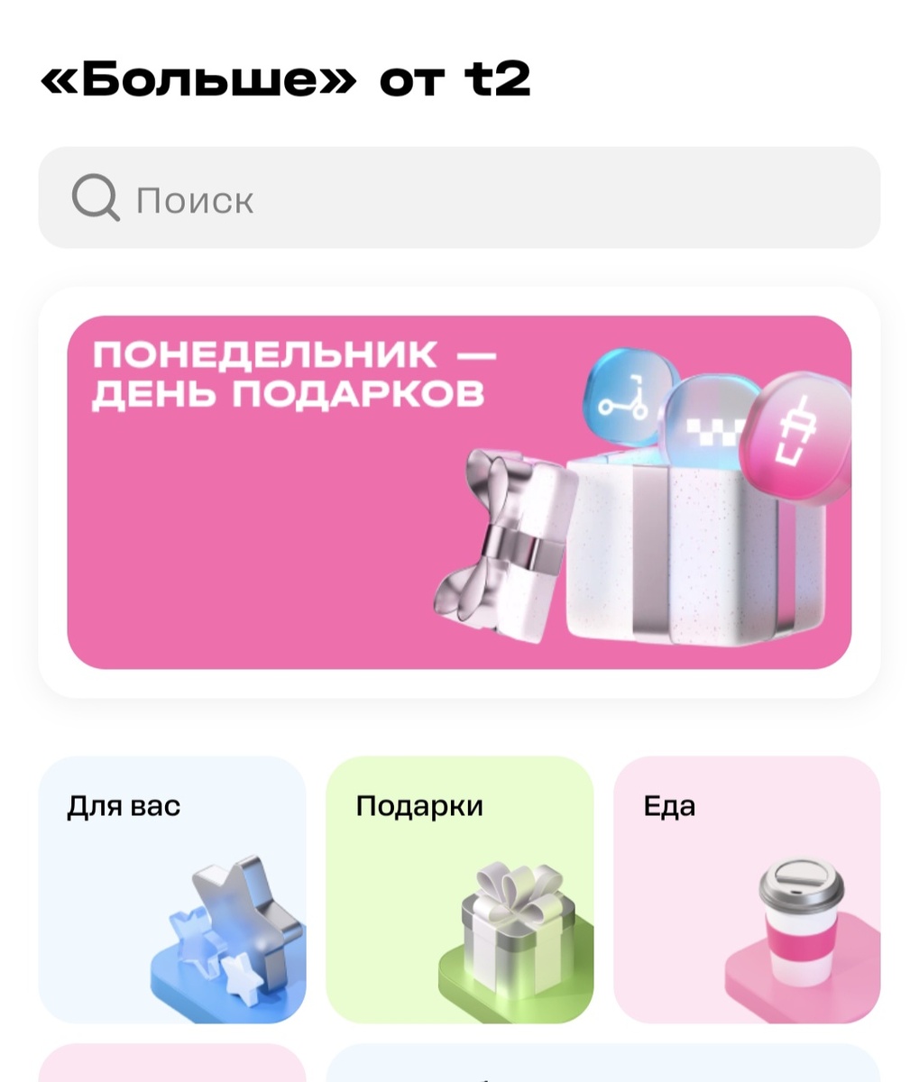 Напоминаю, напоминаю, напоминаю! Сегодня понедельник, а это значит, что акция "Понедельник - день подарков", когда абоненты Т2 могут зайти в приложение и выбрать себе 3 подарка! Подарки разные, но я чаще всего беру кофе и Чикенбургер во "Вкусно и точка" по 1 руб., 200 вау-баллов на Озон или подписку Mixx. Посмотрите, что вам нужно и интересно. Кстати, на этой акции всей семьёй за месяц экономим только на перекусе во "Вкусно и точка" примерно 2000 руб., а ещё и другие подарки! Дают - берите! Скоро акция закончится! А ещё во ВиТ, совместно с Альфа-банком началась акция "Вкусный календарь", когда по пятницам определённый продукт будет продаваться по карте Альфа-банка со 100% кэшбэком! Всем отличного настроения!