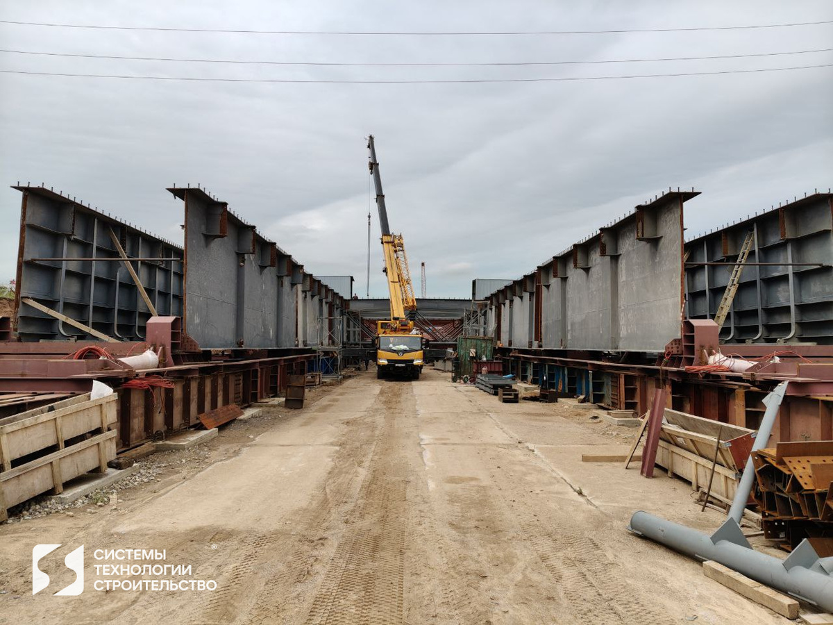 В рамках строительства автомобильной дороги Северного обхода города Пскова, включающей мост через реку Великую, перед нашей командой стояла сложная и амбициозная задача. Основным вызовом проекта стало устройство надвижки пролётного строения моста — технологии, позволяющей собирать части конструкции на одном берегу и постепенно перемещать их через реку до завершения всей длины. Изначально проектировщики предложили использовать стандартный стапель из балок 100 Б1, но такое решение оказалось дорогим и неэффективным. Балки этого типа нужно было бы производить по чертежам, доставлять на объект, а затем они стали бы «мёртвым грузом» — дорогостоящими и непригодными для повторного использования конструкциями.