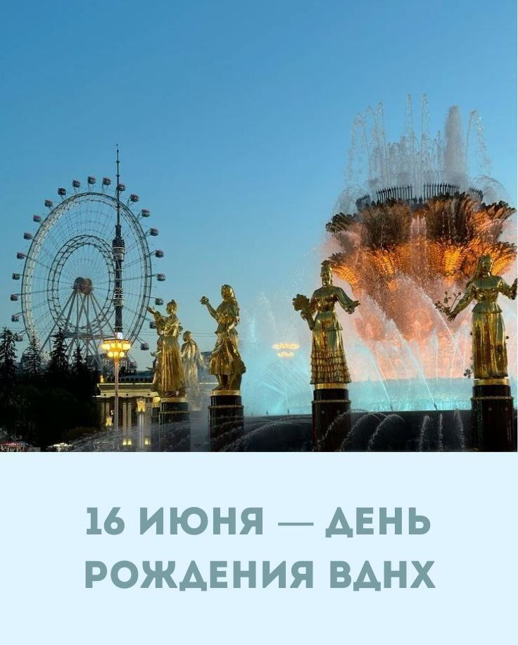 🎉16 июня — День рождения ВДНХ 🎉 Сегодня исполняется 66 лет со дня создания одного из крупнейших выставочных комплексов в мире. Выставка достижений народного хозяйства является ярким и знаковым местом в России. ВДНХ — это место, где гармонично сочетаются история и искусство, культура и наука, традиции и инновации. А вы знали, что⤵️ 🔴ВДНХ — это целый город в городе. Его территория составляет больше 325 гектаров; 🔴фонтан «Дружба народов» покрыт золотом; 🔴здесь стоит космический корабль «Буран»; 🔴изначально выставка называлась ВСХВ — Всесоюзная сельскохозяйственная выставка; 🔴на территории ВДНХ проходили съемки множества фильмов, включая «Москва слезам не верит» и «Человек с бульвара Капуцинов». ❤️ВДНХ — настоящий феномен, объединяющий в себе историю самых разных поколений страны. 🎨/✍🏻 Шуклина Дарья, ФФМК, «Реклама и связи с общественностью», 1 курс #ДеньРожденияВДНХ #МедиацентрМГУимениКуинджи