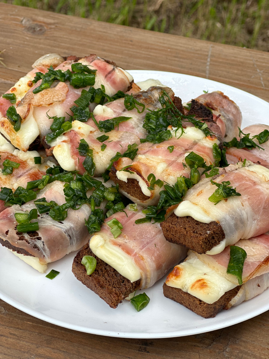Ингредиенты: Приготовление: Шаг 1. Кусочки бородинского хлеба разрезать на две части и натереть чесноком с обеих сторон. Шаг 2. Сыр сулугуни нарезать по форме подготовленного хлеба. Шаг 3. На хлеб выложить сыр с обеих сторон, а затем завернуть хлеб с сыром в полоски бекона. Шаг 4. Будем готовит на мангале, на седых углях без прямого огня, жар должен быть не сильным. Шаг 5. Перекладываем заготовки на решетку и отравляем на мангал. Во время жарки решётку нужно часто переворачивать, чтобы бекон равномерно зарумянился. Шаг 6. Как только сыр начнёт плавиться, снять решётку с огня и переложить бутерброды на тарелку. Шаг 7. Посыпаем свежей зеленью и подаем к столу, только горячими. Приятного аппетита 😋