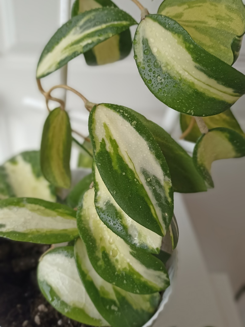 С хойями у меня особая любовь. Они все такие разные — то строгие, то пёстрые, то бархатные, то глянцевые… Два года назад я купила маленький черенок хойи Verticillata variegata (её ещё называют acuta variegata). Всего два узелка, без корней, без надежд — просто слепое увлечение. И я не устояла. Уж слишком необычные у неё были листья: белая середина, зелёные края, как будто по краю прошлась кисточка с изумрудной акварелью. Я принесла её домой, поставила в стакан с водой, и началось самое волнительное — ожидание. Днями наблюдала, не появилась ли корешковая точка. Потом — радость первых корней. Пересадка. Первый настоящий лист. И вот сейчас, спустя два года, передо мной уже не хрупкий черенок, а настоящее пышное растение с десятками плетей, часть из которых свисает с полки, а часть — тянется к окну, как будто благодарит за заботу. У этой хойи листья не просто красивые — они живые. Каждый новый лист отличается от предыдущего. Вариегатность всегда разная: где-то больше белого, где-то зелёное