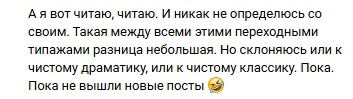 Для самотипирования многих из нас не хватает насмотренности на разных представителей всех 13 типажей. А без нее никак. Если вас интересует собственная классификация в этой системе - советую обратиться к эксперту, который профи в типировании. Тогда вы получите список рекомендаций. И есть даже шанс, что они будут персональными :)