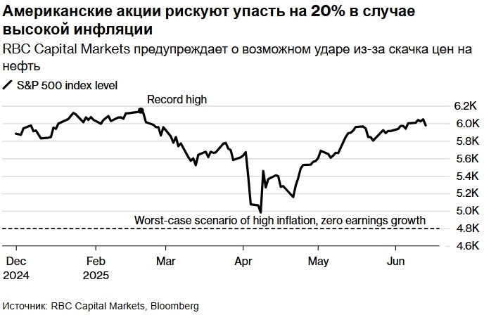 Стратеги прогнозируют потенциальное падение индекса до 4800 пунктов к концу года при «негативном» сценарии или примерно до 5200 пунктов в менее серьезном случае. В отчёте, подготовленном экспертами RBC Capital Markets LLC, рассматриваются три возможных сценария развития ситуации. Согласно этому отчёту, если инфляция резко возрастёт из-за роста цен на нефть, индекс S&P 500 может упасть на 20%. Эксперты, возглавляемые Лори Кальвасиной, отмечают уязвимость американских акций после недавнего роста. Они также считают, что оценки рынка выглядят завышенными. По их мнению, чем дольше и масштабнее будет конфликт на Ближнем Востоке, тем негативнее это скажется на американских акциях. В худшем случае эксперты ожидают, что S&P 500 вернётся к своим апрельским минимумам, если атаки приведут к росту цен на энергоносители. В менее серьёзном сценарии индекс может упасть примерно на 13%. «Конфликт может вызвать дополнительную тревогу по поводу здоровья потребителей, экономики в целом и курса ФРС, что, в