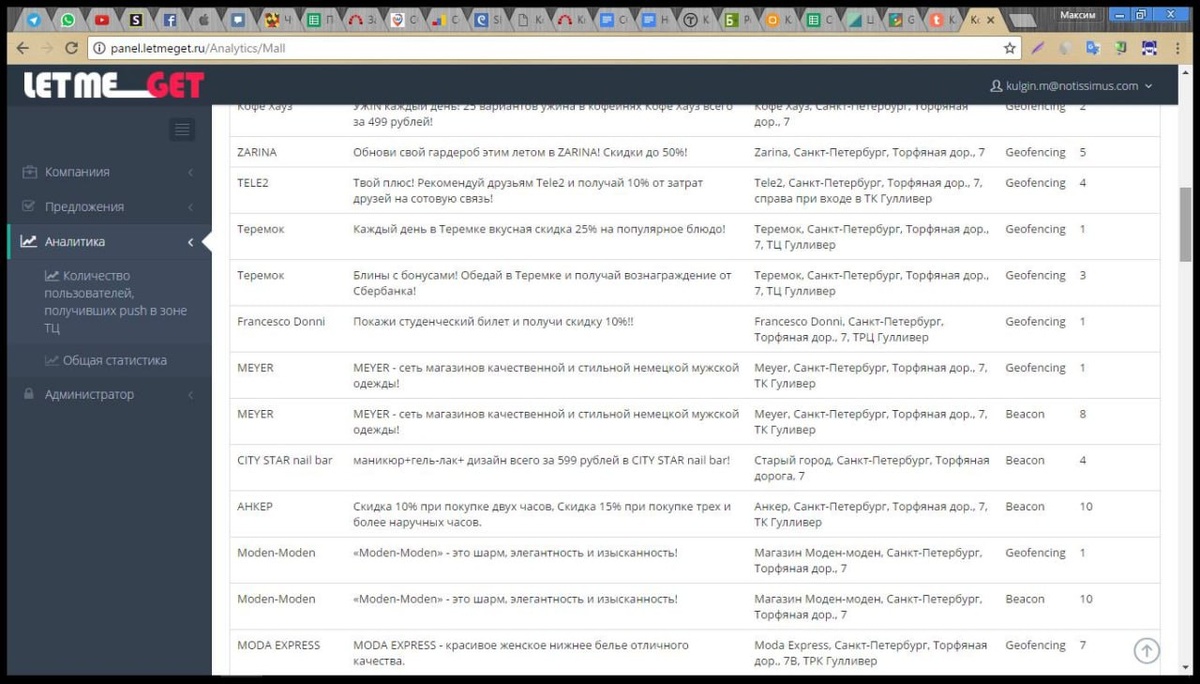 Мне тут на глаза попался скрин личного кабинета нашего проекта letmeget - мы заносили руками (!) акции от разных компаний, дальше человек ставил мобильное приложение и с помощью технологии Geofencing получал push с акциями когда проходил или проезжал мимо заведенных точек на карте (200 метров или меньше). Идея была неплохая, но стухла, т.к. поддерживать актуальность было чертовски сложно... Люди ставили приложение неохотно, хотя уже тогда был Едадил, который делал что-то очень похожее! В итоге Едадил купил Яндекс, а мы благополучно слили бабульки ... :( (кстати наши бабульки и людей, кто поверил и вошел тоже деньгами - вот с тех пор я чужие деньги не хочу брать вообще). Русский ИТ бизнес