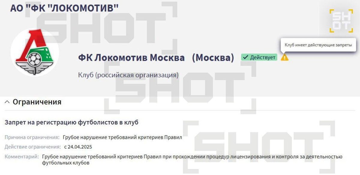 В ответ на пост В «Локомотиве» попытались опровергнуть нашу новость о запрете на регистрацию новых футболистов, из-за которого клуб рискует не заявить на новый сезон перешедшего из «Ростова» нападающего сборной России Николая Комличенко. — У «Локомотива» нет проблем, связанных с лицензированием и регистрацией контрактов игроков команды. Уже не в первый раз в ключевые моменты, как, например, сейчас, когда перед началом сезона идет важный процесс формирования команды, мы наблюдаем не подкрепленный фактами вброс, направленный на дестабилизацию работы клуба, — говорится в сообщении пресс‑службы. Штош, на скрине, оказавшемся в распоряжении SHOT, можно убедиться, кто же прав на самом деле. #SHOTспортивный ☺ Подписывайся на SHOT 🙂 Прислать новость