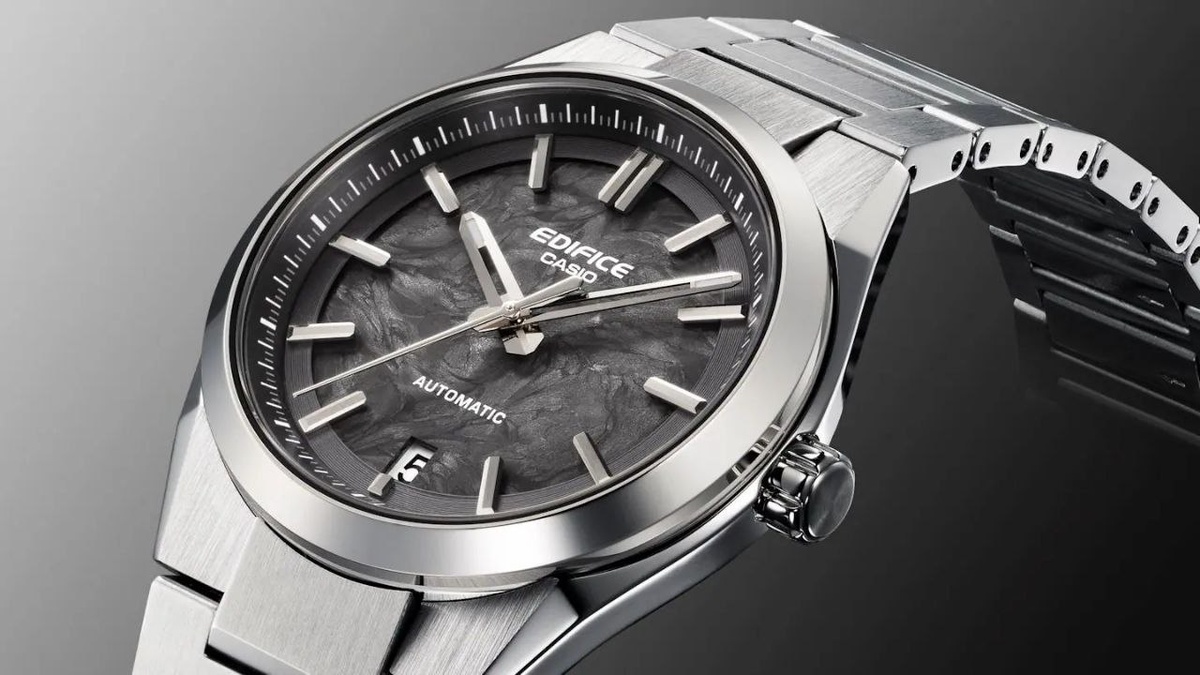 Casio-вские Edifice EFK-100 — событие, которое ломает устоявшийся образ бренда как «кварцевого гиганта». Впервые за пятьдесят лет компания выводит на рынок полноценные механические часы и делает это сразу в любимой автоспортивной линейке: концепция «Speed & Intelligence» получает живой автоматический калибр и новый уровень материалов, а ценовая вилка в 270–450 долларов помещает новинку в тот же диапазон, где давно царят Seiko 5 и Citizen Automatic. Внутри всех версий работает модуль 5755, то есть доработанный Seiko NH35: автоматический подзавод, 24 камня, частота 21 600 пк/ч и запас хода около 40 часов. Casio оставила секундную остановку, ручной подзавод и добавила магнитную защиту, а заодно открыла заднюю крышку — увидеть «двигатель» в работе можно сквозь тонированное минеральное стекло. Для Edifice, где прежде царили аккумуляторы и процессоры, это культурный переворот. Базовая архитектура серии одинакова: корпус 43,5 × 39 × 12,5 мм, водозащита 100 м, плоский сапфир спереди и прозрач