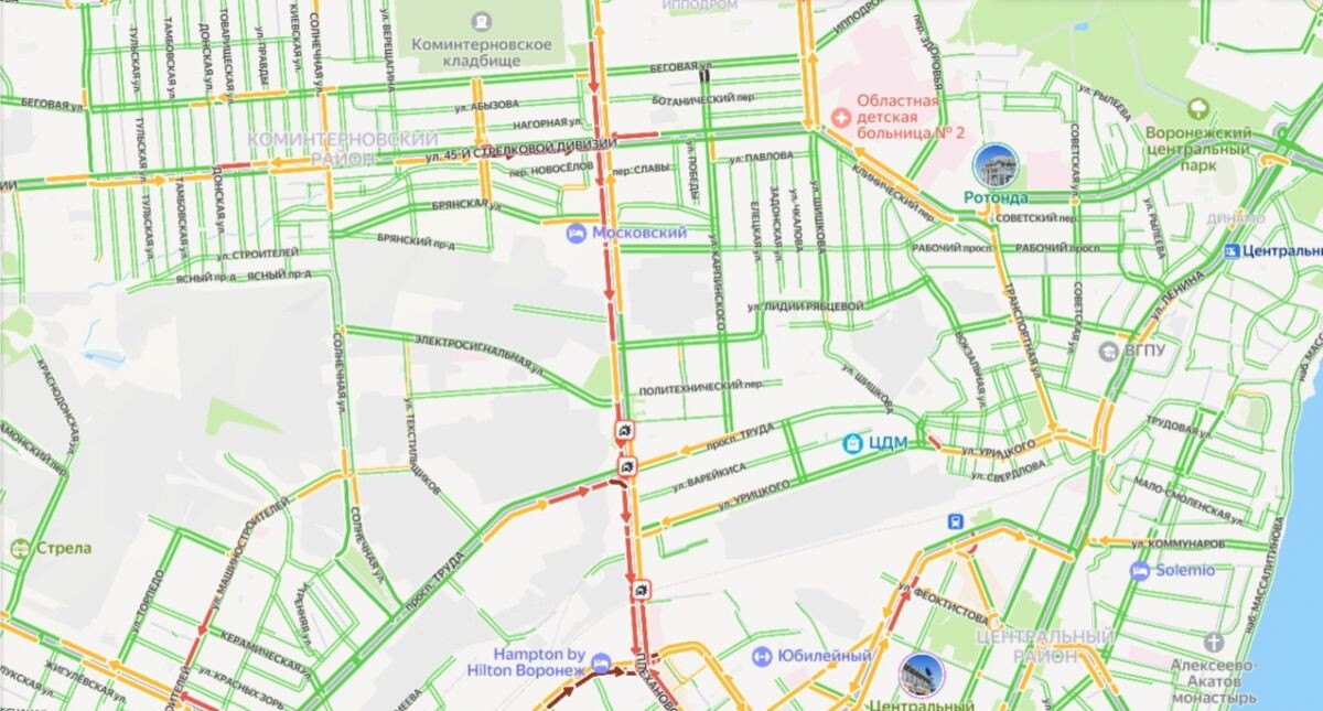 Огромная пробка образовалась сегодня, 16 июня, на Московском проспекте в Воронеже. Причиной затора стали сразу три автомобильные аварии. Согласно данным "Яндекс карт", пробка тянется от пересечения с улицей Беговой, рядом с Мемориальным сквером и плавно переходит в пробку на улице Плехановской. Сразу два столкновения произошло на перекрестке с проспектом Труда. Еще одна авария проищошла в левом ряду, недалеко от железнодорожной станции "Плехановская". А уже в центре города ДТП произошло в среднем и левом ряду на пересечении улиц Плехановской и Кольцовской. Затор тянется до участка дороги рядом с рестораном "Моне". При этом общую дорожную ситуацию в городе оценивают всего в 3 балла. О пробках в городе "ВН" сообщали и сегодня утром. Заторы наблюдались в Коминтерновском районе и в центре города. Наиболее сложными участками традиционно оказались Московский проспект, а также улицы 9 Января и Кольцовская. Однако, по информации сервиса "Яндекс Карты", общая дорожная ситуация в городе оценивал