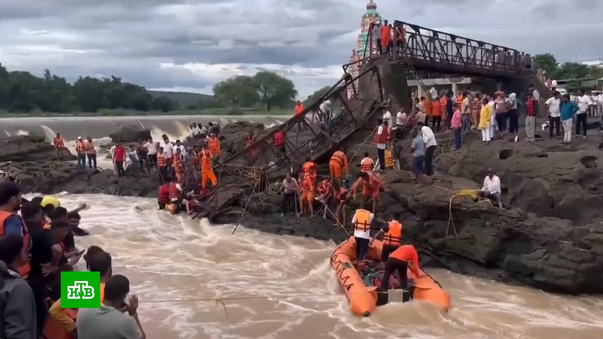 [ Смотреть видео на сайте НТВ ] В Индии в окрестностях популярного у местных и туристов города Пуна обрушился мост через реку. Сообщают, что на центральном пролете моста скопилось огромное количество людей, пожелавших сделать фото на фоне живописного пейзажа. Переправа не выдержала такой нагрузки. Два человека погибли. Около 40 удалось вытащить из воды, они в больницах с серьезными травмами. Число пропавших без вести пока никто не может назвать даже приблизительно. Их унесло течением реки. После мощных ливней оно стало более бурным, чем обычно. На месте продолжается поисково-спасательная операция. Штат, где произошел инцидент, относится к наиболее богатым в Индии. Однако представители местных властей описывают рухнувший мост как «старый и ржавый». [ Смотреть видео на сайте НТВ ]