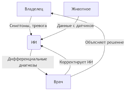 ИИ таким образом определяет свое место в лечебно- диагностическом процессе. Всё замыкает на себя (ИИ) и обратная связь с владельцем у врача. Связи врача и пациента (животного) нет вообще. ИИ просто красавец! Но для практики такая схема не приемлима. Работать и работать!