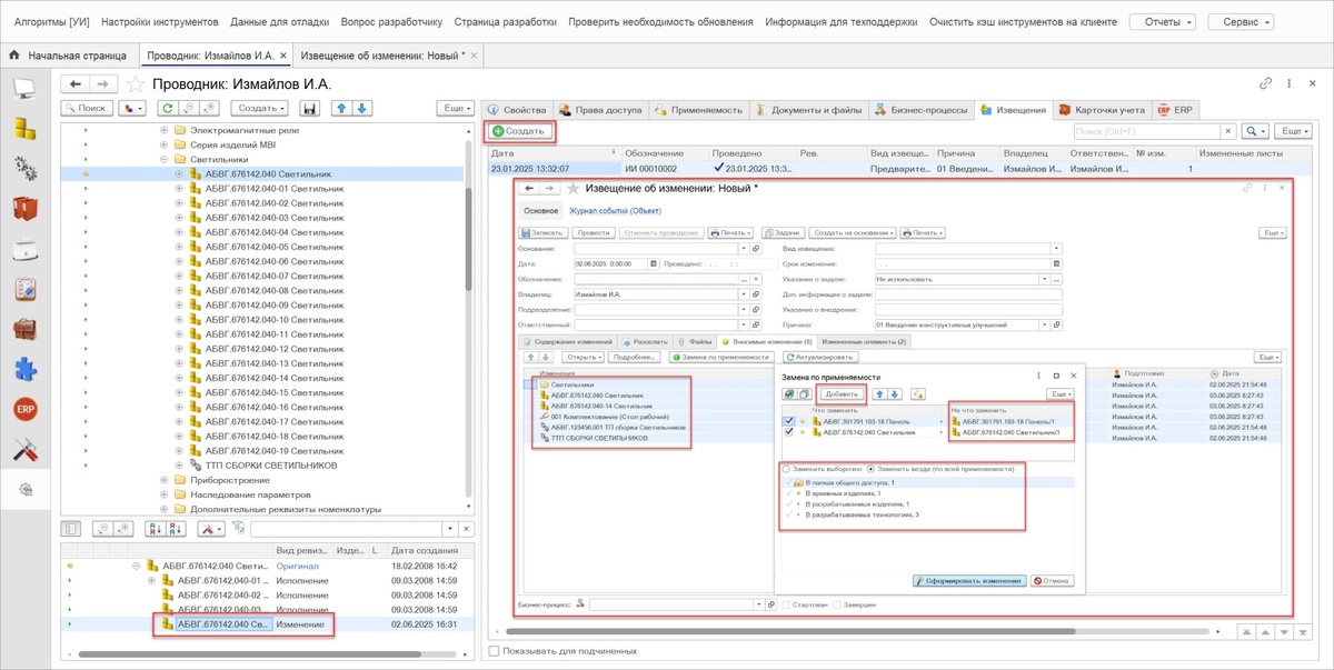 При создании нового извещения об изменении на основе внесенных изменений в составе изделия, система автоматически запрашивает выбор варианта замены по применяемости, отображая доступные опции и результат замены. Дополнительно, во вкладке «Вносимые изменения» доступна функция замены «На выбранную ревизию». При этом система проверяет применяемость архивной ревизии и автоматически формирует действия по замене.