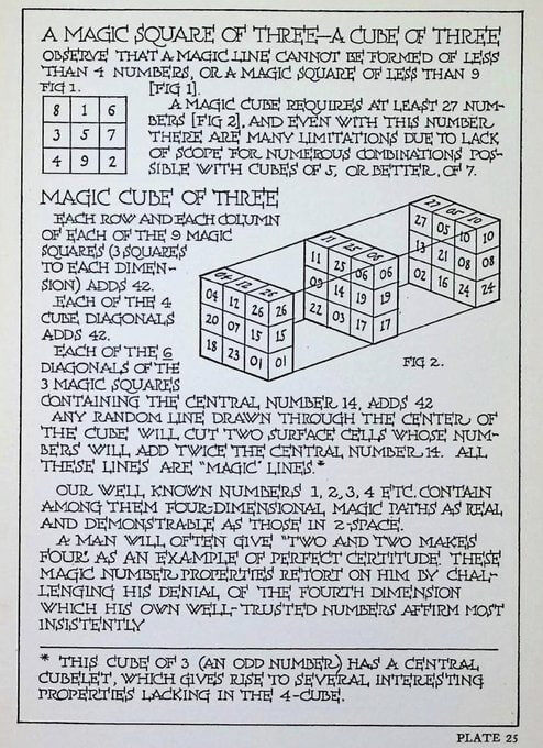 На изображении показан магический куб 3×3×3, то есть трёхмерный аналог магического квадрата, где сумма чисел в каждой строке, столбце, слое и диагонали равна 42.