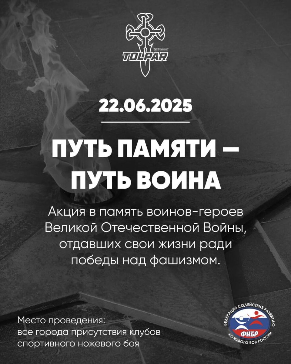 Школа спортивно-прикладного ножевого боя "Толпар" запускает всероссийскую акцию "Путь памяти — Путь воина" и приглашает всё ножевое сообщество почтить память воинов-героев, которые погибли в годы Великой Отечественной Войны, защищая нас всех от фашистской чумы. Все участвующие филиалы ШСПНБ "Толпар" соберутся 22 июня у различных мемориальных мест в своих городах и возложат цветы в знак памяти о героическом подвиге наших воинов и той неизмеримой цене, которую они заплатили, чтобы другие могли жить в свободной и гордой стране-победителе! Все желающие Школы и клубы ножевого боя могут присоединиться и сделать то же самое в своих городах. ШСПНБ "Толпар" с удовольствием выложит в своих соцсетях фотографии всех участников акции.