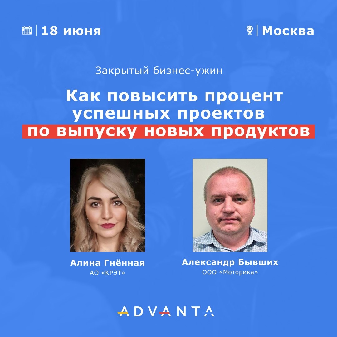 Как повысить процент успешных проектов по выпуску новых продуктов? 🗓 18 июня, с 16:00 до 20:00, очно в Москве ADVANTA организовывает встречу экспертного сообщества проджект-менеджмента! Тема: «Как повысить процент успешных проектов по выпуску новых продуктов». Если вы занимаетесь разработкой новых продуктов, и вам важно производить их качественно и в срок — приходите. 18 июня ведущими спикерами станут: — Алина Гнённая, руководитель Проектного офиса АО «КРЭТ», с докладом «Синергия успеха: как проектное управление способствует ускорению разработки новых продуктов» — Александр Бывших, руководитель Проектного офиса компании «Моторика», с докладом «Выводим новые продукты на рынок: как повысить процент успешных проектов» — С докладом «Система сокращения сроков проектов по выводу новых продуктов» выступит архитектор-идеолог ADVANTA Денис Базин. 💥 Подытожит погружение в тему круглый стол «Что влияет на успешность проектов по выводу новых продуктов и их сроки: примеры из практики». Н