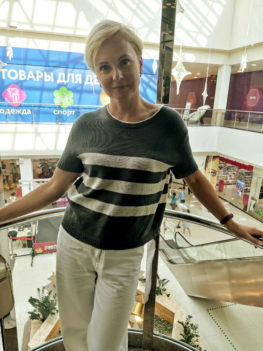 Эта футболка была одним из первых изделий, которое я связала на вязальной машине. Тогда я только купила верхнюю фактуру, но не о ней сейчас. Итак, для эксперимента мне понадобилось 200 гр. мерсинизированного хлопка 2-х цветов. Футболка весит 135 гр, остальное ушло на образцы. В работу взять мерсинизированный хлопок рекомендую потому, что изделие будет нежным и мягким. Далее образцы, это конечно долгая история. Выкройка футболки имеет прямой силуэт с круглой горловиной и японским плечом. Свобода облегания большая +10 см, плечо спущено. Трудности при вязании не возникло, разве, что на одной фантуре пришлось вручную перебирать резинки (достаточно трудозатратный процесс). Также вывязывание японского плеча на спине вначале получилось стянутым, т. к. нить тонкая, а убавки идут в каждом ряду. А какое было ваше первое изделие?