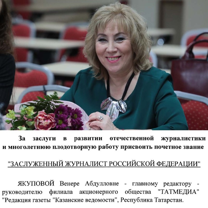 ™️👏Руководителю филиала АО «Татмедиа» «Редакция газеты «Казанские ведомости» Венере Якуповой было присвоено почетное звание «Заслуженный журналист Российской Федерации»