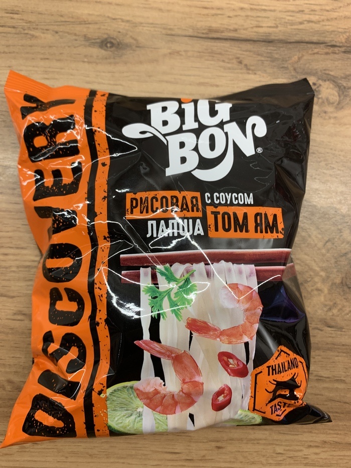 Фото ПОСЛЕ. Разбухла, окрепла. На фото не очень видно, но она по-прежнему достаточно белая и полупрозрачная. После разбухания видно, какая неравномерная ширина у полосок лапши. Есть наваристый бульончик, плавает какой-то жирок. Пахнет - обалдеть! Я даже не ожидал. Очень точно подобраны ароматизаторы и вкусовые добавки в соус. Если закрыть глаза и втянуть аромат носом - почти невозможно отличить от оригинального ТомЯма. Единственное отличие - нет запаха креветки и кокосового молока, но есть яркий запах лайма, имбиря и чего-то просто курино-рыбного. Но явно не креветки. Остальные ароматы выражены явно меньше. Грибы тоже не ощущаются. Также похоже что использовались растительные сухие сливки, чтобы имитировать кокосовое молоко. Острым перцем не пахнет вообще. Пробуем. Вкус похож. Не 100%, но имитация хорошая, приятная. Солёность и кислинка в меру, есть легкий молочно-лаймовый вкус. Нужно понимать, что это просто лапша и имитация бульона, ни грибов, ни мясов, ни рыбов там нет. Совсем не острое, но какая-то легкая пряность есть. Кто острое не любит - можно смело есть. Дочери 5-летке понравилось. Лапша, как ожидалось, плотная, приятная. Но разница в ширине удивляет - то очень тонкая, то сразу в половину вилки. Но мозг не обманешь - наличие только лапши и бульона не делает его тем самым Том Ямом: все равно машинально ожидаешь выловить грибочек или креветку. Вердикт Снова убеждаюсь, что серия Дискавери отличается хорошей вкусовой подборкой суповых основ. Поэтому - норм, сойдет, но как гарнир «со вкусом…», так как очень уж не хватает тех самых кусочков грибов и морепродуктов, нужно позаботиться о том, чтобы их добавить самому.