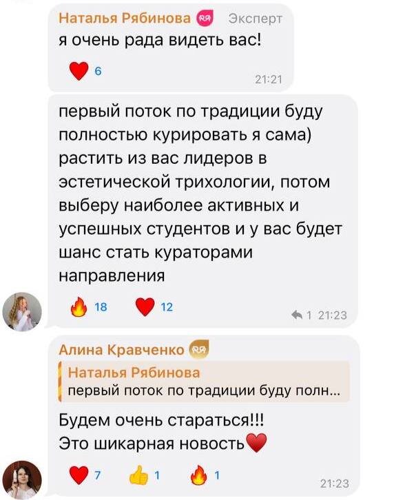Мы начали обучение на 1 потоке курса по Эстетической Трихологии. Просто посмотрите какая обратная связь от девочек и какая у нас атмосфера внутри учебного чата.