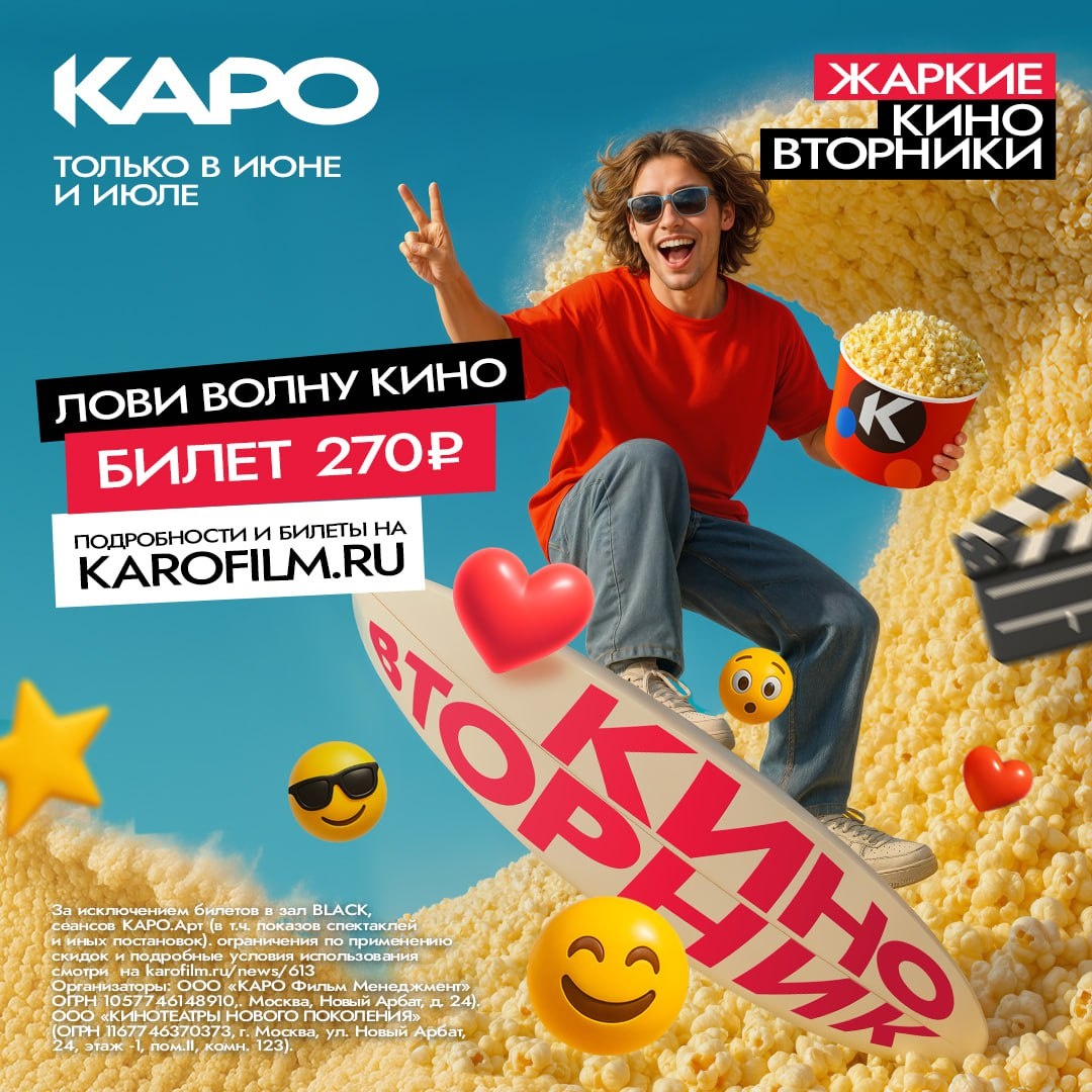 ⚡️ КИНОВТОРНИК СНОВА НА ВОЛНЕ! Олды вспомнят, а новеньким лучше присесть: начиная с завтрашнего дня каждый вторник билеты будут продаваться по приятной фиксированной цене* — независимо от времени сеанса и формата зала! Поэтому уже завтра смотрим кино по неприлично жаркой цене: 💥 В Москве, Тюмени, Новосибирске и Краснодаре — 270 рублей 💥 В Санкт-Петербурге — 200 рублей 💥 В Екатеринбурге, Калининграде и Сургуте — 150 рублей *Акция не распространяется на сеансы в зале BLACK, а также сеансы КАРО.Арт. С планами на вторник определились: расписание и билеты лови на сайте😏 Реклама