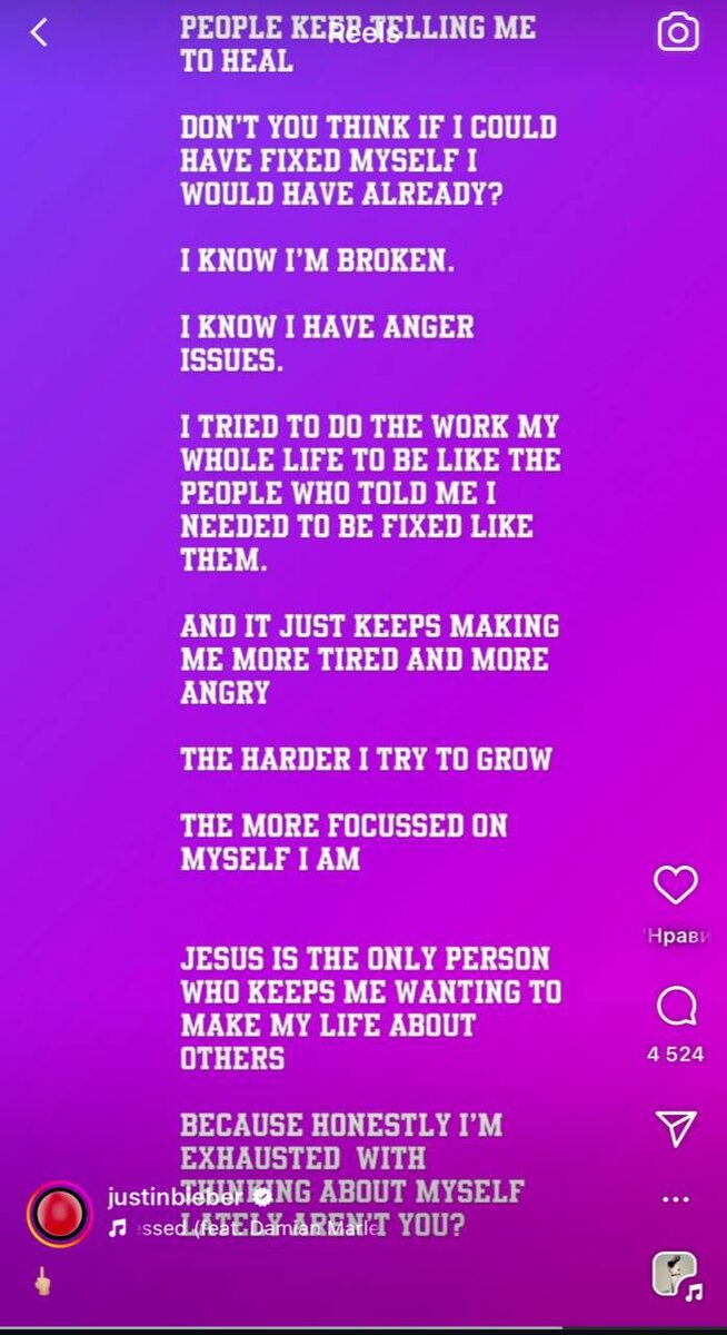 Джастин ответил всем комментаторам, которые советовали ему обратиться к психотерапевту. «А вы не думали, что если бы я мог себя починить, то давно бы уже это сделал? Я знаю, что я сломан. Я знаю, что у меня проблемы с гневом. Я всю жизнь пытался работать над собой, и это только делает меня ещё более уставшим и ещё более злым.» «Только Иисус остаётся тем, кто даёт мне силы жить не только ради себя. Потому что, если честно, я устал от постоянных попыток разобраться в самом себе.» Скрин из запрещенной экстремистской социальной сети.