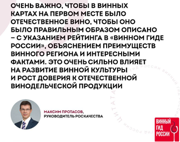 *«Винный гид России» – ежегодный проект, который Роскачество реализует совместно с Минпромторгом России, Минсельхозом России и Ассоциацией виноградарей и виноделов России при поддержке АО «Россельхозбанк». Информационный партнер проекта – РИА Новости (входит в состав медиагруппы «Россия сегодня»). Исследование является ежегодным и охватывает все ведущие винодельческие регионы страны.