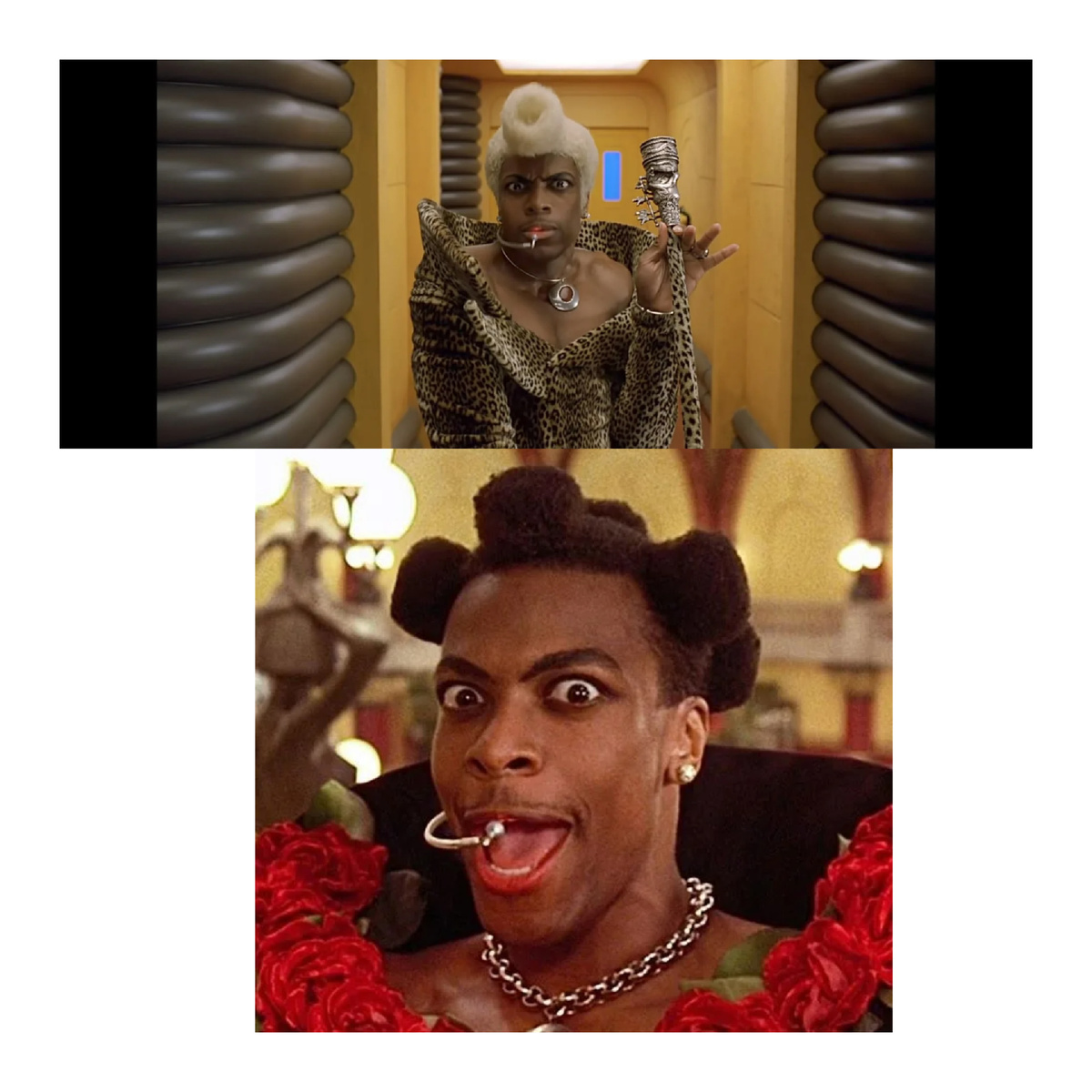 В жаркие летние дни вспомним кинокостюмы умеющего обнажать актеров сложносочиненными аутфитами Жана Поля Готье с @Нина Спутницкая Костюм Руби Роль Руби Род, которую играет комик Крис Такер, изначально предназначалась Принсу, и это легко угадывается в костюмах в стиле диско 1970-х годов. Наряды Руби Род экстравагантны и неопределены в гендерном отношении, как и аутфиты Принса. Его костюм-комбинезон с леопардовым принтом с головы до ног и авангардными лацканами, который сочетается с его командой, микрофоном с леопардовым принтом и светлым париком в виде единорога. Черный комбинезон с лацканами в виде красных роз, который он надевает в опере, тоже неплох. Но, пожалуй, в лидеры выходит костюм из сцены со стюардессами. Голубые холодные тона аутфитов женских персонажей и хищный принт - создают интересную драматургию цветов и фактур, раскрывают тему доминирования. Эпизод этот очень яркий, в нем интересно использован параллельный монтаж. Костюм Лилу Для известного кутюрье работа над ки
