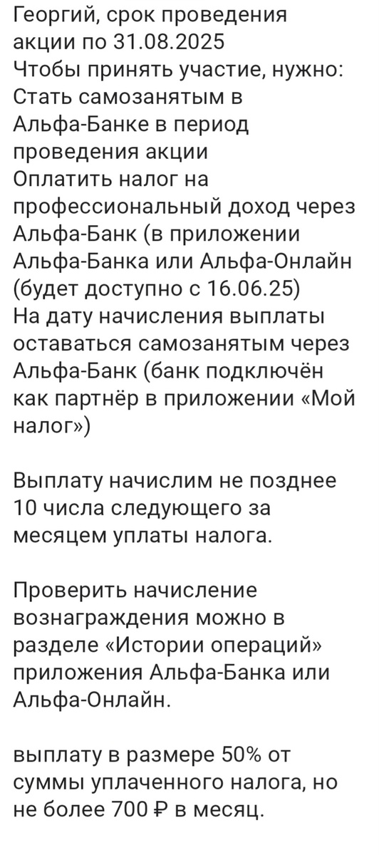 Максимум — 700₽ в месяц, всего до 2100₽ за лето ➝ Эффективная сумма трат 1400₽ в месяц и 4200₽ за весь срок 📌 Для участия в акции нужно: ✅ Стать самозанятым через Альфа-Банк в период проведения акции — через приложение Альфа-Банка или Альфа-Онлайн ✅ Добавить Альфа-Банк как партнёра в приложении «Мой налог» ✅ Оплачивать налог через приложение Альфы — с 16.06.25 появится нужный раздел ✅ На дату начисления выплаты вы всё ещё должны быть самозанятым с Альфа-Банком (то есть банк должен быть подключён как партнёр) 🔔 Важно: если вы уже зарегистрированы как самозанятый, но не через Альфу, участвовать в акции всё равно можно. Главное — в период действия акции оформить заявку на самозанятость через Альфа-Банк, даже если вы уже стоите на учёте. Это можно сделать без повторной регистрации в ФНС и открытия нового счета Период акции: с 09.06 по 31.08.2025 Начисление — до 10-го числа следующего месяца после уплаты налога 👉 2200₽ за Альфа-карту / 6500₽ за Брокерский счет