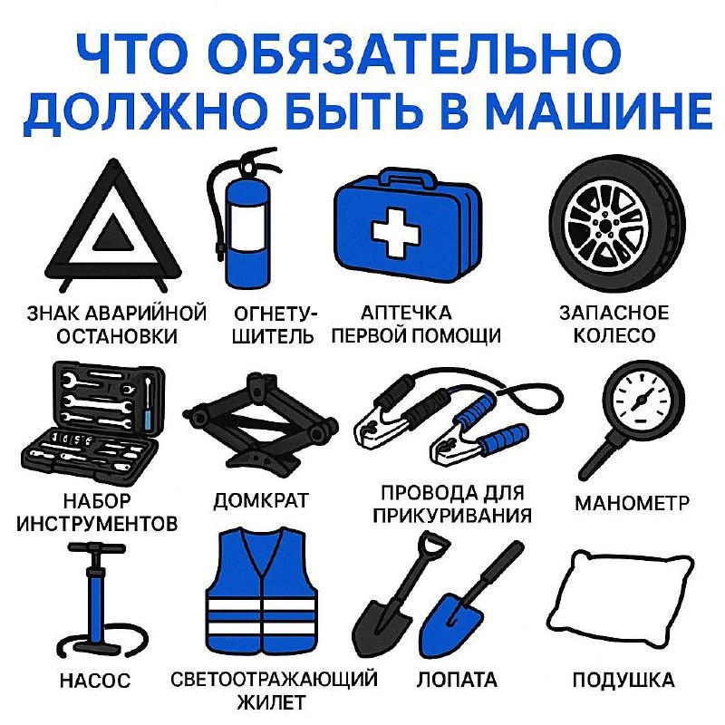 Что всегда должно быть в машине? На фото — базовый набор, который должен быть в каждой машине. Не потому что «так положено», а потому что внештатные ситуации случаются у всех, даже у тех, кто едет просто до магазина. #GT_АвтоСоветы