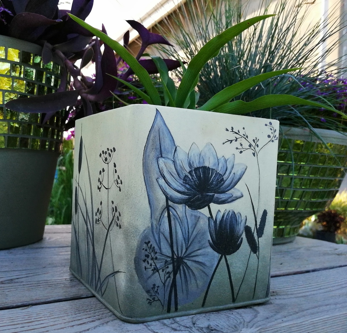 В прошлом году я купила простую жестяную банку для сыпучих в фиксе, чтобы перекрасить её и превратить в горшок. Выбрала самую большую по объёму из тех, что были в наличии – около двух литров (точнее не помню уже). Если интересно, подробнее, как всё это делалось, я писала в статье ⬇️ Но в течение сезона у меня постоянно оставалось ощущение, что я перемудрила – рисунок был лишним. Горшок нужен красивый, но не должен столько внимания на себя забирать. К этому лету я решила, как минимум, горшок перекрасить в один цвет, а дальше посмотрим – может, и ещё что в голову придёт – более благородное. А осенью, когда разбирала контейнерный сад и освобождала горшки от земли, я взяла наполненный жестяной горшок одной рукой, и под тяжестью содержимого край деформировался – слишком тонкая жесть. Фикс, что с него взять. Летом-то я переносила всегда двумя руками, а тут поторопилась и понадеялась, что выдержит. Ну да ладно. Но теперь появилась ещё одна проблема – нужно укрепить стенки банки, выкиды