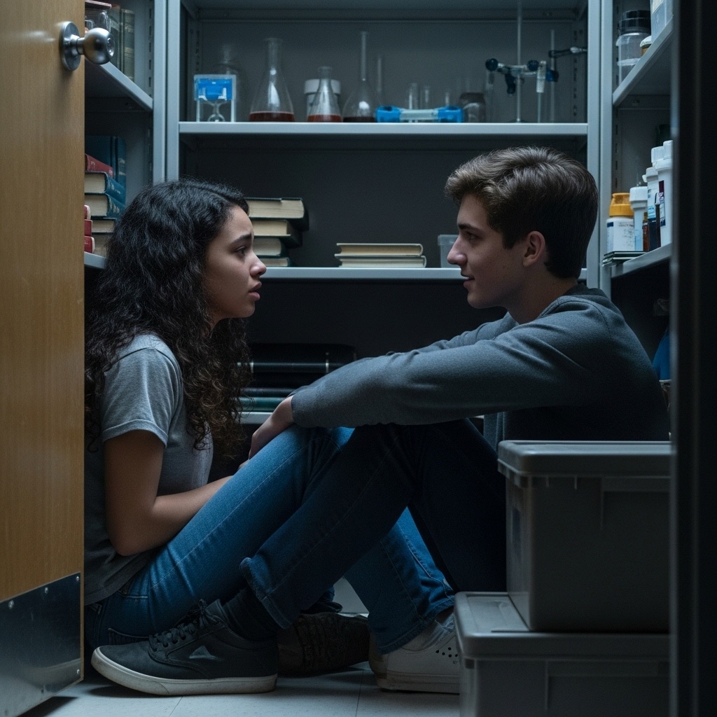 Не в силах больше находиться в этой комнате, Алиса попросилась у учительницы в лаборантскую — маленькую подсобку, примыкавшую к кабинету, чтобы «умыться». Учительница, видя её состояние, разрешила. Алиса зашла в тесную комнатку, заставленную колбами и скелетами, и прислонилась лбом к холодной стене. Через минуту дверь тихо открылась, и вошёл Марк. Он просто встал рядом, не говоря ни слова.