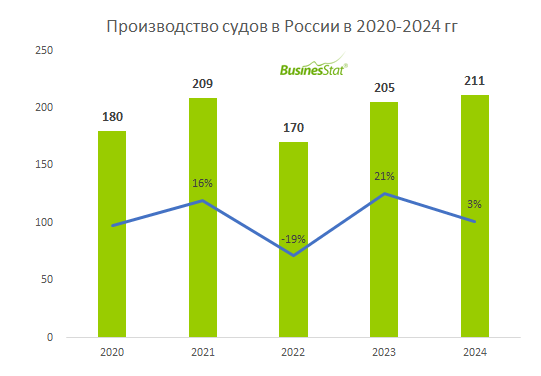 В 2024 г выпуск судов в России увеличился на 3% и составил 211 шт.